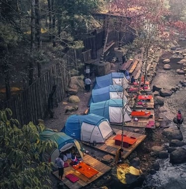 Dikelilingi pepohonan pinus dan sungai. Nikmati pengalaman glamping dan kabin yang damai dengan udara segar dan suasana alam yang menenangkan.