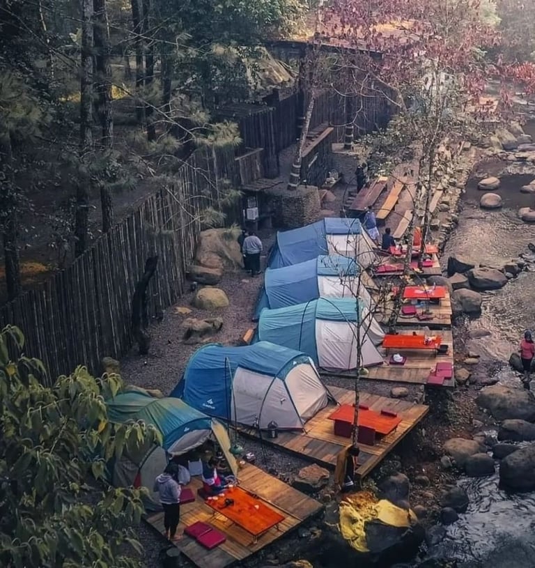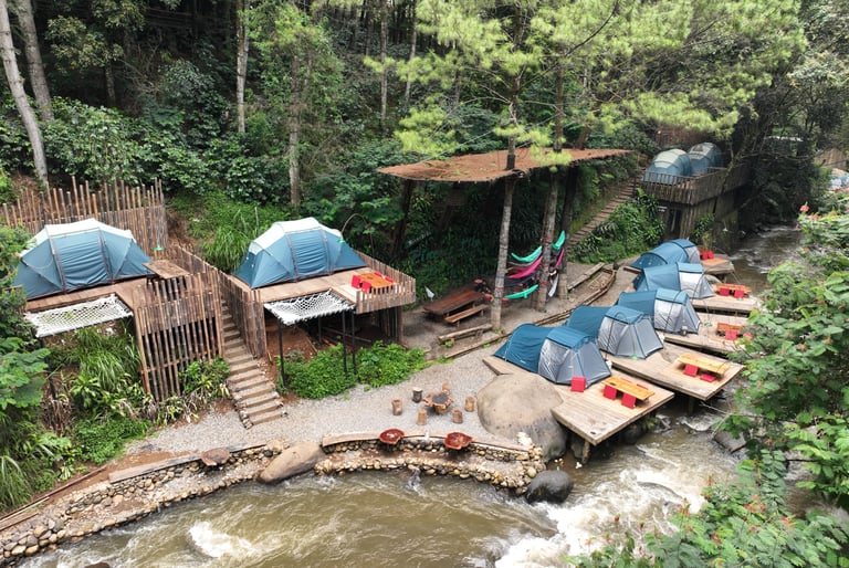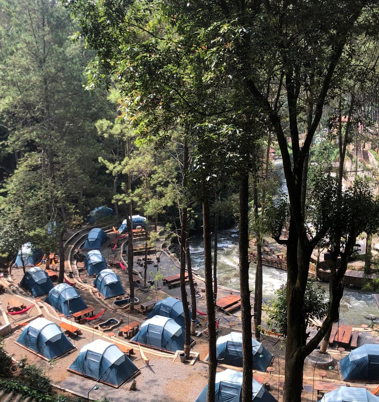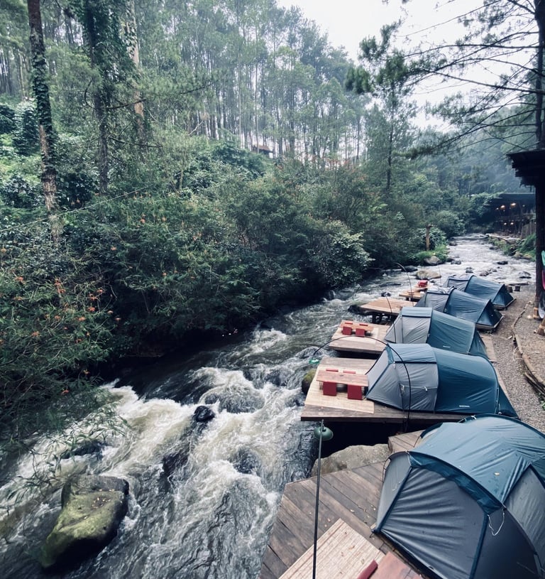 Lakukan reservasi untuk merasakan pengalaman glamping di tengah hutan pinus dan indahnya Sungai Palayangan